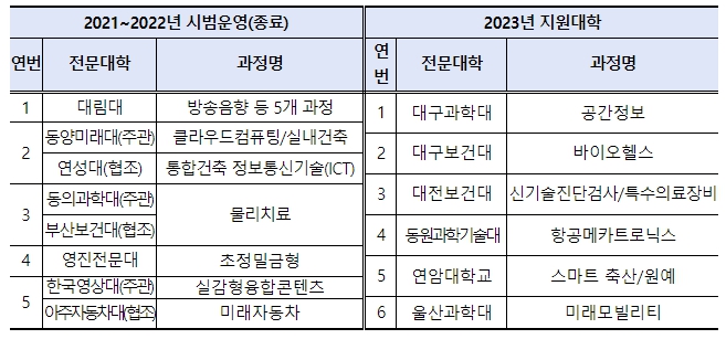 교육부는 2021~2022년에 5개교(3개 연합체, 대학 2개교)를 선정하여 시범 운영했고, 2023년에는 6개교를 마이스터대로 선정·지원했으며, 올해는 전문기술석사과정을 신규로 인가받은 대학 중 3개교를 추가로 선정하여 총 9개교(2023년 6개교+신규 3개교)를 지원한다.