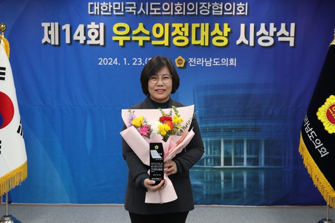 ![]() 23일 박경미 도의원은 대한민국시도의회의장협의회가 주관한 제14회 우수의정대상 시상식에서 우수의정대상을 수상했다. |