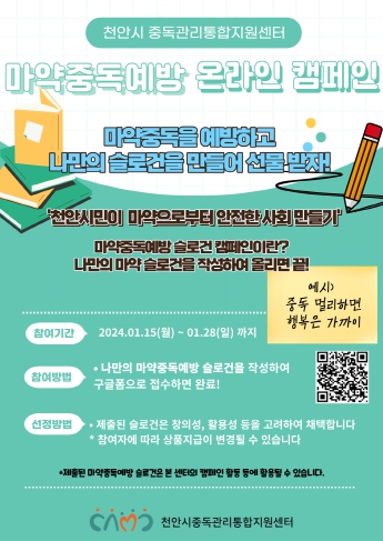 이번 캠페인은 시민들이 함께 마약 중독 예방에 대한 나만의 슬로건을 만들어 마약 폐해 예방을 위한 시민 참가 분위기를 확산하고 중독으로부터 안전한 천안시를 조성하기 위해 추진됐다.