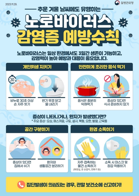노로바이러스감염증을 예방하기 위해서는 ▲흐르는 물에 비누로 30초 이상 손 씻기 ▲끓인 물 마시기 ▲음식물 충분히 익혀 먹기(85℃ 이상에서 1분 이상 가열) ▲조리도구 구분해 사용 등 개인 위생수칙을 준수하는 것이 중요하다.