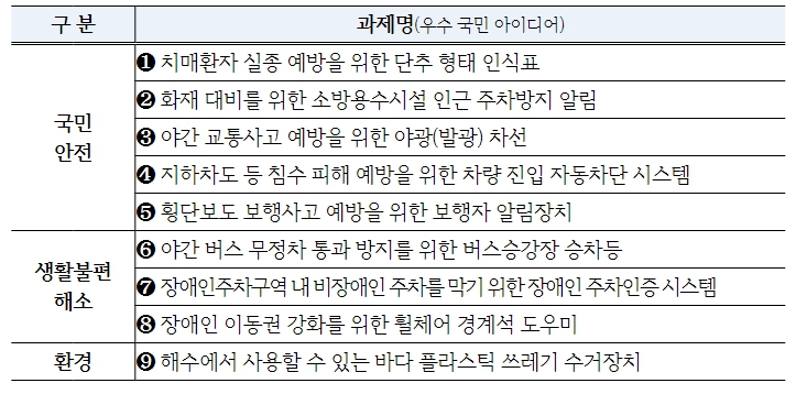 혁신제품을 공모하는 국민 아이디어는 지난해 9월 25일부터 10월말까지 대통령실 국민제안 누리집을 통해 접수된 총 387건의 국민 아이디어 중 전문가들이 국민체감도, 신규성 및 시급성 등의 기준으로 심사를 거쳐 최종 채택된 9개의 우수 아이디어이다.