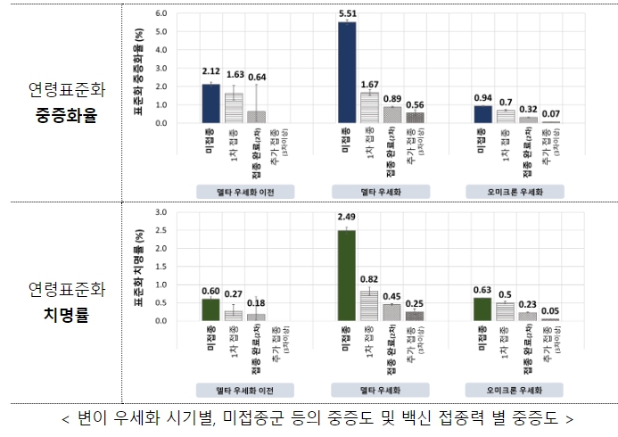 백신 접종 이후 미접종군 등의 중증화율은 2.12%, 델타 우세화 시기 5.51%, 오미크론 우세화 시기 0.94%를, 치명률은 각각 0.60%, 2.49%, 0.63%를 보였다.