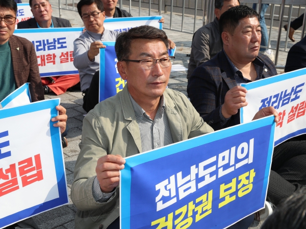 ![]() 김재철 도의원이 2023년 10월 18일, 전남도의회가 용산 대통령실 인근에서 개최한 ‘전남 의대설립 촉구 집회’에 참석해 손팻말을 들고 있다.[전남도의회 제공] |