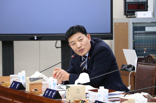 ![]() 정철 도의원이 24일에 열린 감사관실 소관 업무보고에서 현안 질의를 하고 있다. |