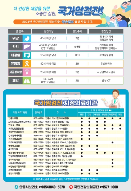 권향숙 건강증진과장은 “연말은 검진 기관 예약자가 많아 대기 시간이 길어지므로 연초에 여유롭게 국가 암 검진을 받고 건강한 한 해를 시작하시기 바란다”라고 당부했다.