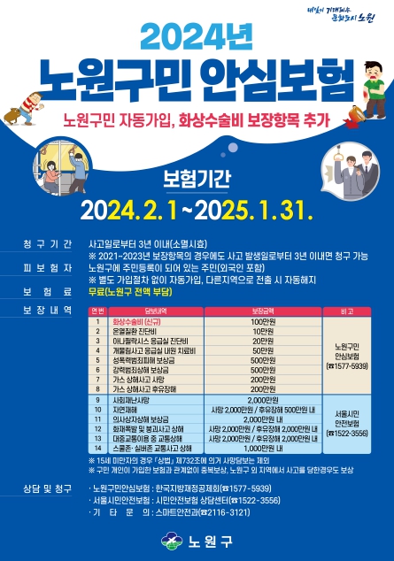 노원구에 주민등록이 된 주민이라면 누구나 별도의 가입 절차 없이 자동 가입된다. 보장 기간은 2024년 2월 1일부터 2025년 1월 31일까지이며, 보장 기간 중 전입한 구민도 혜택을 받을 수 있다. 보험비는 구에서 전액 부담하고 전출 시 자동 해지된다.