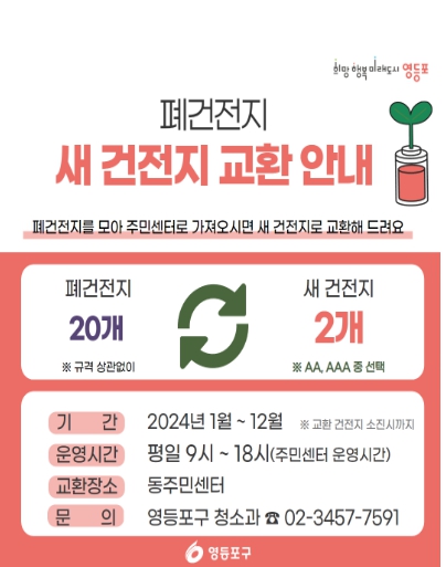 소형 건전지 등 크기나 규격에 상관없이 폐건전지 20개를 모아 가까운 동 주민센터에 방문하면, AA규격이나 AAA 규격의 새 건전지 2개와 교환할 수 있다. 1인당 최대 60개까지 폐건전지를 교환할 수 있다. 다 쓰고 남은 건전지를 전용 수거함에 별도로 버려야 하는 수고로움도 덜 수 있는 것이다.