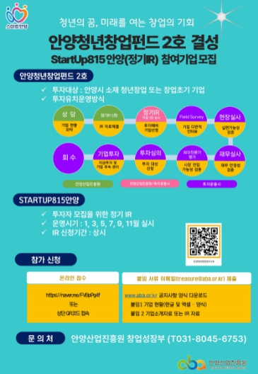 ‘스타트업815 안양’은 2호 펀드를 투자할 우수 청년창업기업을 발굴하기 위해 매 홀수달에 1회씩 진행하는 IR 행사다. 투자 유치를 희망하는 기업은 진흥원 홈페이지를 방문해 신청서를 제출하면 된다. 이후 현장 및 재무 실사 등의 평가 과정을 거쳐 선정 여부가 결정된다.