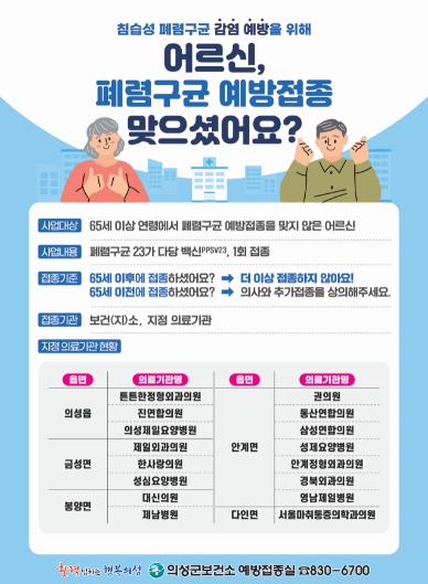 김주수 의성군수는 “면역력이 약한 65세 이상 어르신에게 침습성 폐렴구균 감염증은 치명적이므로 대상자는 폐렴구균 예방접종을 꼭 하기 바란다”라고 당부했다.