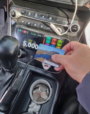 ![]() 맘편한 100원 택시 이용 후 교통카드로 결제 중인 모습 |