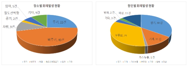 화재통계에 의하면 화재 발생 장소별 현황은 비주거 40건(46%)'주거 22건(25.4%)'차량 9건(10.3%)'기타 9건(10.3%)'임야 5건(5.7%)순으로 나타났으며 원인별 현황은 전기 30건(34.5%)'부주의 29건(33.3%)'기타 15건(17.3%)'기계 11건(12.6%)'방화 2건(2.3%)순으로 나타났다.