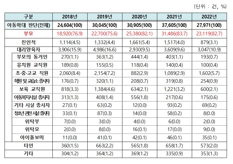 아동학대 사례 중 절대적 비중을 차지하는 것은 ‘가정 내’ 학대이다. 지난해 9월 보건복지부가 발표한 ‘2022년 아동학대 연차보고서’에 따르면 전체 학대행위자 중 부모의 비중이 82.7%로 절대적인 비중을 차지하고 있으며, 학대장소도 ‘가정 내’에서 발생한 비중이 81.3%를 차지한다. 부산지역 역시 부모가 학대행위자인 경우는 (’20년)81.2%→(’21년)82.0%→(’22년)76.9%였다.