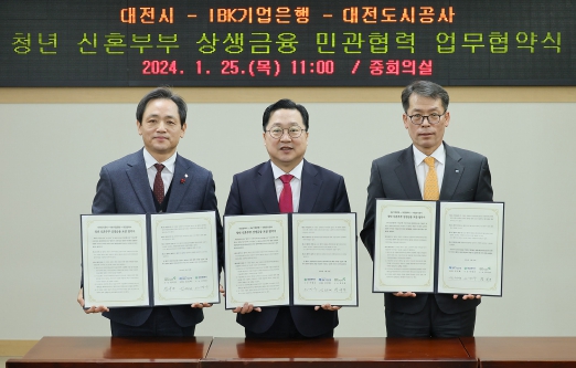 대전시는 25일 이장우 대전시장과 김성태 기업은행장, 정국영 도시공사 사장이 참석한 가운데 ‘청년 신혼부부 상생금융 포괄 민관협력 업무협약’을 체결했다.