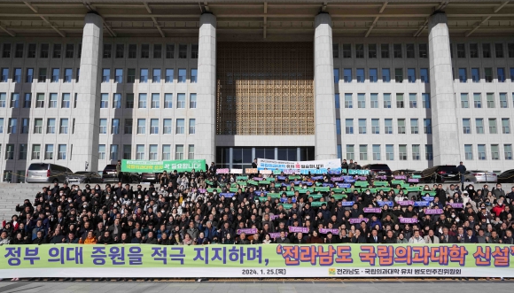 ![]() 25일 서울 국회의사당 앞에서 열린 ‘전라남도 국립의과대학 유치 염원 범도민 서울 결의대회’에서 참석자들이 지역 간 의료격차 해소를 위한 전남도 의과대학 유치를 촉구하는 결의를 하고 있다. |