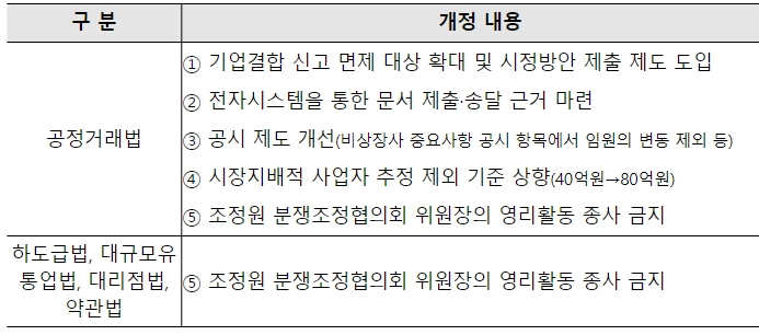 공정거래위원회는 기업결합 제도 개선, 공정위 심의절차 개선, 공시 제도 개선 등을 내용으로 하는 『독점규제 및 공정거래에 관한 법률』개정안 등 5개 법률 개정안이 2024년 1월 25일 국회 본회의를 통과했다고 밝혔다.