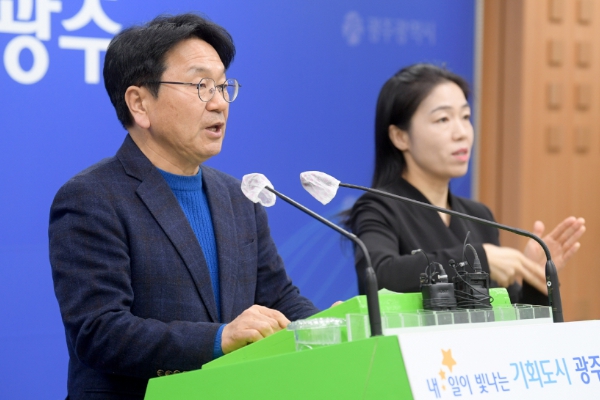 ![]() 강기정 광주광역시장이 25일 오후 시청 브리핑룸에서 달빛철도 특별법 국회 통과에 따른 광주‧대구 공동 환영문을 발표하고 있다./광주광역시 제공 |