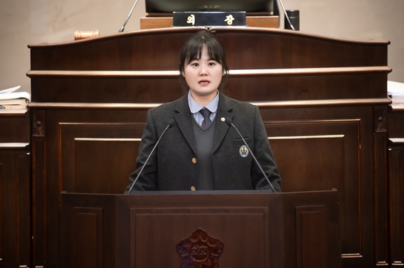 ![]() 제300회 임시회에서 이수련 의원이 교복은행사업의 활성화 방안을 촉구하고자 교복을 착용하고 5분 자유발언에 임하고 있다. |