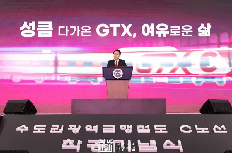 ![]() 1월 25일 윤석열 대통령은 의정부시청 다목적체육관에서 열린 수도권광역급행철도(이하 GTX) C노선 착공 기념식에 참석했다. |