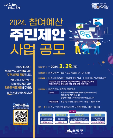![]() 은평구, 2024년 참여예산 주민제안 사업공모 포스터 |