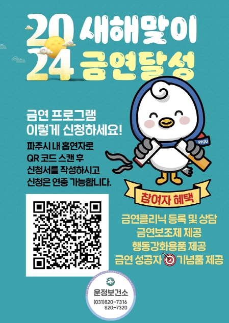 ![]() 파주 운정보건소 금연클리닉, 정보 무늬(QR코드)로 간편하게 등록하세요 |