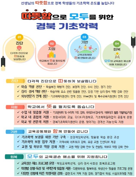 ‘따뜻함으로 모두를 위한 경북 기초학력’이라는 비전 실현을 위해 △다각적 진단 체계 구축 △촘촘한 기초학력 학습 안전망 지원 △기초학력 보장 지원 기반 구축 △모두의 교육결손 해소 등 4개 과제를 중점적으로 추진한다.