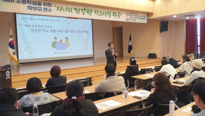 제주시교육지원청은 겨울방학을 이용하여 학생들의 진학 대비, 새로운 환경 적응을 위해 학부모 연수를 단계적으로 진행하고 있는바, ‘예비 중학생 학부모를 위한 꿈끼이음123교육과정의 이해’, ‘예비 고등학생 대입 준비를 위한 학부모의 역할’에 이어 세 번째 예비 초등학생 학부모 대상으로 운영했다.