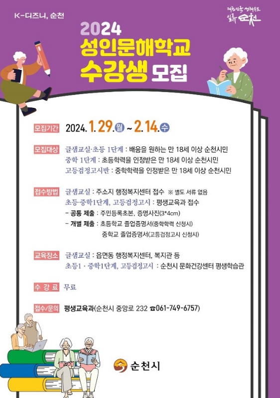 ![]() 2024년 순천시 성인문해학교 수강생 모집 |