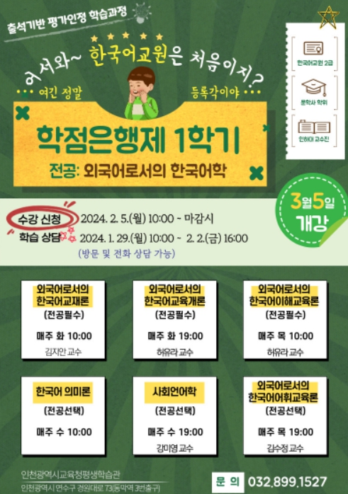 학점은행제는 '외국어로서의 한국어학' 전공과목을 제공하며, 인하대 국어문화원과의 업무협약을 통해 인하대 교수진의 강의를 대면 수업으로 진행한다. 또한 2024년부터 전공필수 7과목을 1년 안에 이수할 수 있게 과목을 증설해 학습자들이 학위 취득 기간을 단축할 수 있도록 했다.