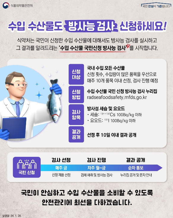 국민 신청 방사능 검사가 시행되면 식약처는 국민이 직접 신청하는 수산물에 대해 방사능 검사를 실시하고 그 결과를 신청인에게 안내하는 동시에 수입식품방사능안전정보 누리집에 공개한다.