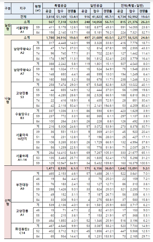 지역별로는 서울 위례 65.1대 1, 고양창릉(나눔) 40.1대 1, 서울 마곡 30.7대 1 등의 경쟁률을 기록했으며, 특히 서울 위례 59㎡ 일반공급 159.8대 1, 서울대방 84㎡ 일반공급이 76.2대 1, 서울마곡 59㎡ 일반공급이 66.5대 1을 기록하며 높은 경쟁률을 보였다.