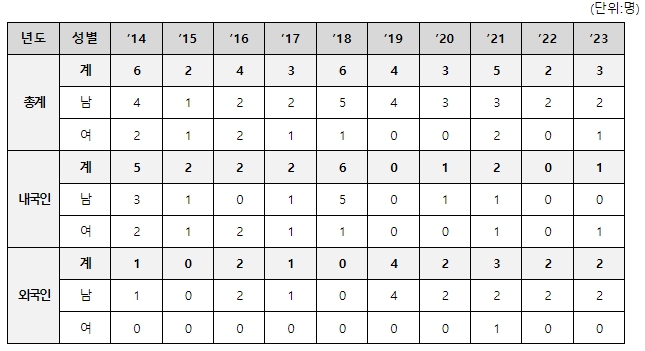 ![]() 국내 한센병 신환자 발생 현황(2014-2023) |