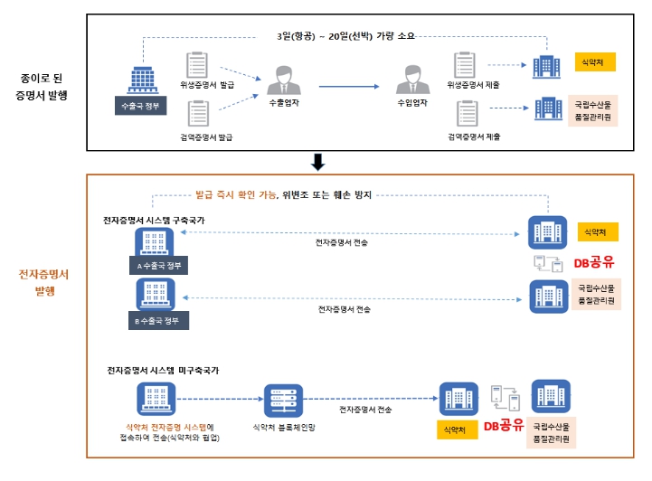 현재 각 기관의 위생∙검역 증명서 서식이 다르고 서로 증명서 정보를 공유할 수 있는 체계가 구축되지 않아 수입자는 각 기관이 전자증명서 시스템을 직접 구축한 국가에 한해서만 전자증명서로 제출(이외 종이 증명서 원본 제출) 해야 하는 불편함이 개선되는 것이다.
