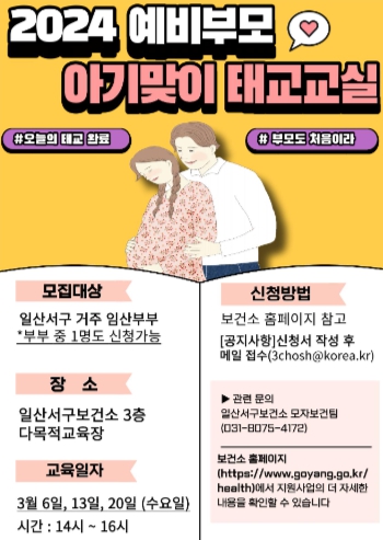 일산서구보건소는 태교교실 이외에도 관내 주소지 임산부모를 대상으로 출산 친화적 사회 분위기 조성을 위해 모성검사, 영양제 지원, 유축기 대여사업 등 다양한 건강증진서비스를 제공하고 있다.