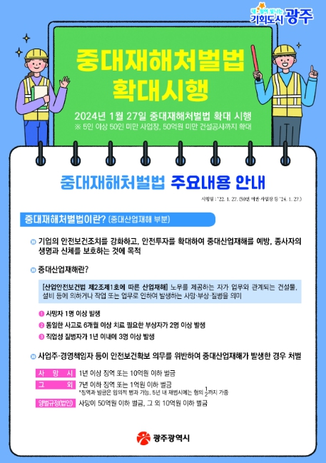 광주시는 27일부터 법 적용을 받게 된 소규모 사업자가 중대재해처벌법을 제대로 알지 못하고 있는 상황을 고려해 지난해부터 홍보활동을 펼쳐왔다.