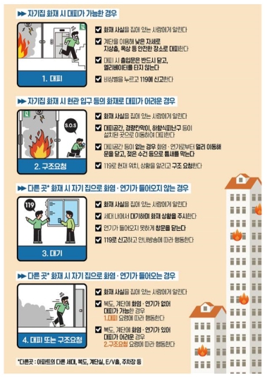 이에 소방서에서는 최근 새롭게 마련된 아파트 화재 피난안전대책을 적극 홍보한다고 한다.