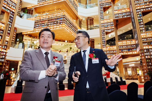 ![]() 이재준 수원시장(왼쪽)이 오픈식에 앞서 신세계프라퍼티 임영록 대표와 이야기를 나누고 있다. |