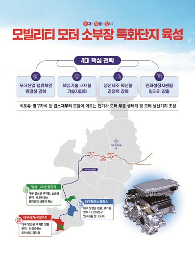 모터 소부장 앵커-협력기업 간 밸류체인 강화를 위한 산업 집적과 핵심 기술 국산화 등 모터특화 산업혁신생태계 구축을 위해 대구국가산업단지를 비롯한 특화단지에 155억 원을 투입해 글로벌 모터생산 거점으로 조성한다.