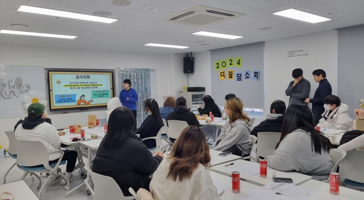 ‘다꿈 담소회’는 프로그램 경험이 없던 신규 학교 밖 청소년들에게 학교밖센터의 공간과 프로그램, 연간 일정에 대해 안내하고, 2024년 프로그램에 참여할 수 있도록 동기 부여하는 시간으로 꾸며졌다. 기존에 참여 중인 학교 밖 청소년들도 함께해 새롭게 또래관계를 형성하고 소속감을 경험할 수 있도록 구성했다.