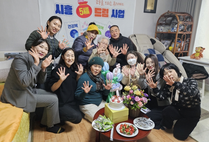 ‘시흥오복(5福)드림 사업’은 대야ㆍ신천동의 만 90세 이상 독거 어르신 가구에 민관이 함께 찾아가 다섯 가지 복(▲건강복-혈당ㆍ혈압 체크 ▲행복-꽃꽂이를 활용한 원예치료 ▲생일복-케이크 및 다과와 함께 축하 ▲사랑복-지역 인사의 선물 전달 및 포옹 ▲흥복-지역 가수의 노래 공연)을 주제로 감동을 전하는 사업이다.