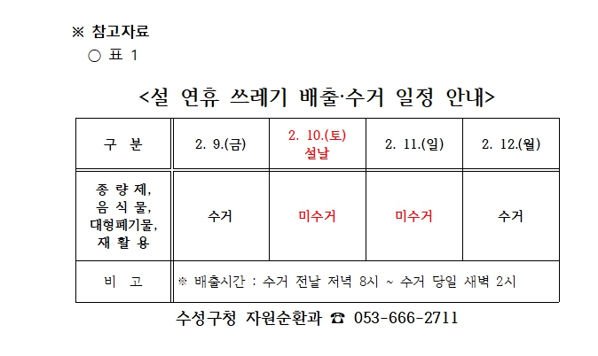 한편, 수성구 지역은 설 당일인 2월 10일과 다음 날 11일에는 생활쓰레기를 수거하지 않는다. 12일 수거를 재개해 14일까지 연휴로 밀린 쓰레기 수거를 모두 마칠 계획이다.