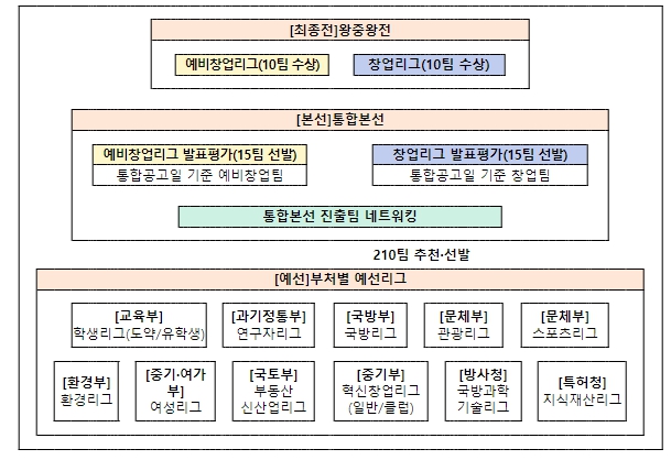 ‘도전! K-스타트업 2024’은 1월 29일 통합공고를 시작으로 9월까지 부처별 예선리그가 진행되며, 이후 예선리그를 통과한 (예비)창업자들이 경쟁하는 통합본선(210개팀)이 이어져 왕중왕전에 진출할 30개팀을 가리게 된다.