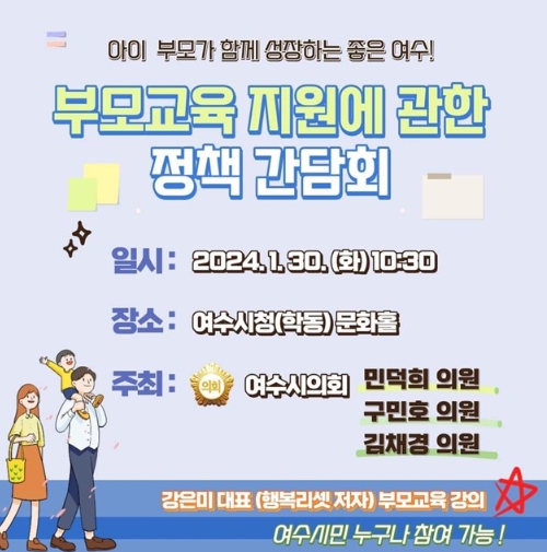 간담회를 공동 주최한 민덕희 구민호 김채경 의원은 “아이와 부모가 함께 성장할 수 있는 영유아보육 환경이 조성된다면, 행복한 지역공동체로서 여수로 한 걸음 더 나아갈 것이다”며 “강은미 대표의 부모교육 강연도 함께 준비한 만큼 관심 있는 부모님들의 많은 참여를 바란다”고 밝혔다.
