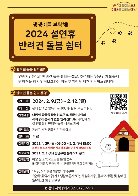 2024년 1월 기준 강남구에는 반려동물 4만여 마리가 등록되어 있으며, 이는 서울시 25개 자치구 중 가장 많다. 이렇게 꾸준히 증가하는 반려동물 가정을 위해 구는 올해 다양한 반려동물 지원사업을 시작한다. 그 중 구민들의 요청이 많았던 반려견 돌봄 쉼터를 오는 설 명절부터 시작해, 고향 방문과 여행 등으로 반려견과 함께 할 수 없는 구민을 지원할 계획이다.