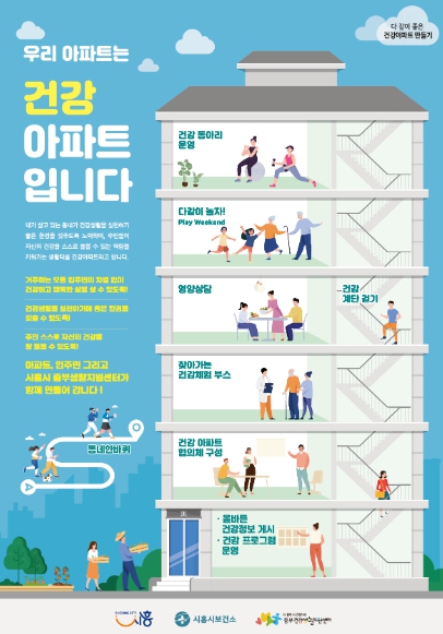 건강 아파트 만들기 프로그램은 ▲플레이스타터와 함께하는 집 앞 놀이터 ▲동네 한바퀴 ▲계단 걷기 ▲파크 트레이너 ▲플로깅 챌린지 ▲찾아가는 건강홍보관 ▲행복운동교실(댄스 및 스트레칭) ▲올바른 약물 복용법 교육 ▲우울증 예방 교육으로 진행된다.