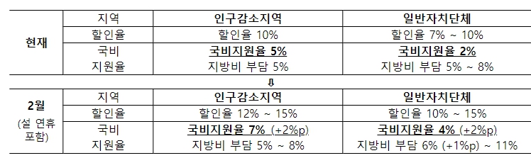 국민이 받는 할인율이 최대 15%까지 상승함에 따라 발생하는 지자체의 부담을 덜어주기 위해, 국비지원율 2월분을 2%p 상향하여 인구감소지역은 5%→7%로, 일반자치단체는 2%→4%로 올린다.
