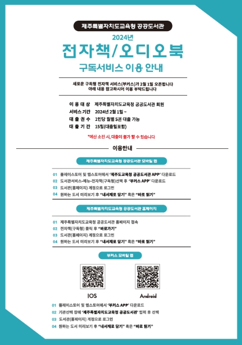 이용 방법은 PC인 경우 제주특별자치도교육청 공공도서관에 접속하여'전자책(구독형)'바로가기 버튼을 클릭하면 바로 이용할 수 있고, 모바일(스마트폰, 태블릿 등)인 경우 제주도교육청 공공도서관 앱 또는 부커스 앱을 설치한 후 서비스 이용이 가능하다.