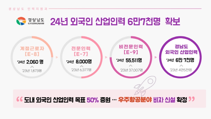 이에 정부는 경남도 건의를 바탕으로 조선업 분야 쿼터 신설 및 연간 5,000명확보, 조선업 비자심사 기일 단축 등을 발표했고, 올해는 우주항공분야(항공기·항공기부품 제조원,연간 300명) 비자 쿼터 신설이 확정되어 산업인력 확보에 청신호가 켜졌다.