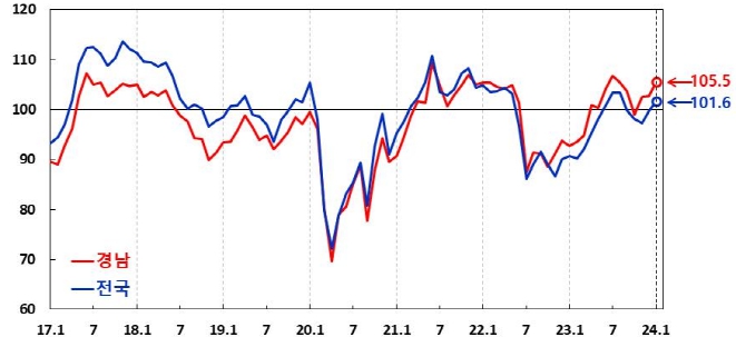 (소비자동향) 24일 한국은행이 발표한 ‘2024년 1월 경남지역 소비자 동향조사 결과‘에 따르면, 1월 경남지역 소비자심리지수(CCSI)는 105.5로 전월(102.7)보다 2.8p 상승했으며, 3개월 연속 오름세이다.