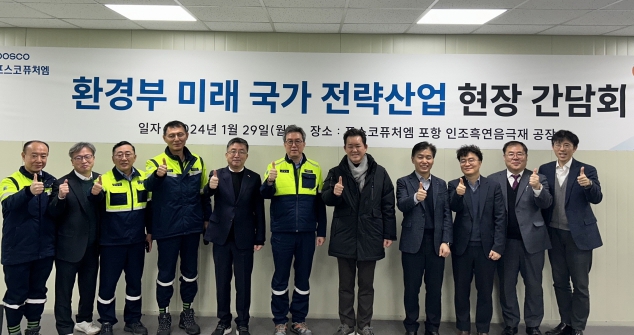 ![]() 장상길 포항시 부시장(왼쪽 다섯 번째)과 임상준 환경부 차관(오른쪽 다섯 번째), 김준형 포스코퓨처엠 사장(오른쪽 여섯 번째)이 29일 포스코퓨처엠 포항 인조흑연 음극재 공장에서 열린 환경부 미래 국가 전략산업 현장 간담회를 마치고 기념 촬영하고 있다. |