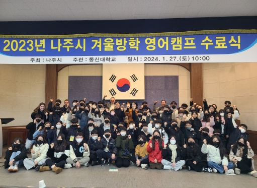 ![]() 나주시가 지난 15일부터 2주간 동신대 국제교육원에서 관내 초등학교 5~6학년 학생들을 대상으로 겨울방학 영어캠프를 실시했다. 사진은 영어캠프 수료식 장면. |